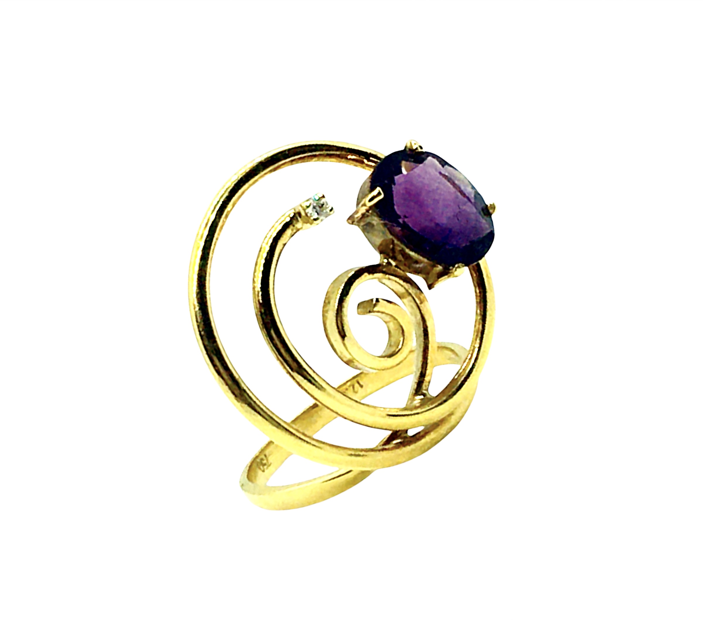 A unique handcrafted gold ring 18K attorned with a purple amethyst and a tiny diamond.